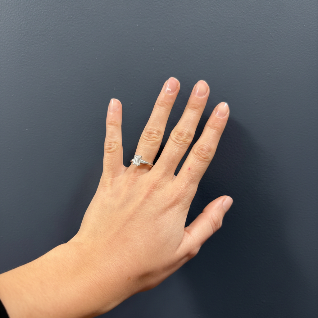 CARTIER Paris. BAGUE en platine sertie d'un diamant taille émeraude entre deux diamants trapèze. Signée et numérotée. Poids brut 3,8 g. Certificat du Gemmological Institutes of America en date du 2 novembre 1978 attestant poids 2,02 cts, couleur E